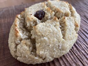 (発芽モードにした玄米を自家ミキサーで挽き玄米クリーム(グレインクリーム)を合わせて玄米酵母で発酵させています。今月は、スダチの柑橘にココナッツレーズンを合わせて爽やかに焼き上げます。型に入れないでカンパーニュ風に焼き上げます)