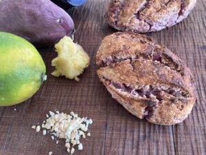 (発芽モードにした玄米を自家ミキサーで挽き玄米クリーム(グレインクリーム)を合わせて玄米酵母で発酵させています。今月は、旬のレモンを丸ごとペーストにしてアーモンドと蒸したさつまいも合わせて爽やかに焼き上げます。型に入れないでカンパーニュ風に焼き上げます)
