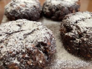 (発芽モード高きび(雑穀)100%にドライフルーツナッツ、ココアを合わせて酵母で発酵させて焼き上げます。小さな雑穀にはたくさんのエネルギーが詰まっています)の上からココナッツフラワーをかけています。