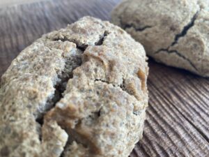 (発芽モードにした玄米を自家ミキサーで挽き玄米クリーム(グレインクリーム)を合わせて玄米酵母で発酵させています。今月は、旬の紫芋+サンフラワーシードを合わせて焼き上げます。型に入れないでカンパーニュ風に焼き上げます)