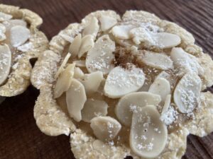 (発芽モード玄米と豆を使ってタルト生地を仕上げ、中に玄米クリームにオレンジ、レモンのピール、シナモンを合わせたクリームを流し入れ焼き上げています。本場は、米をミルクで炊いてバターが入り米も粒のまま入りますが、これを玄米ミルクで代用して作っております。上からココナッツフラワーをかけています。)